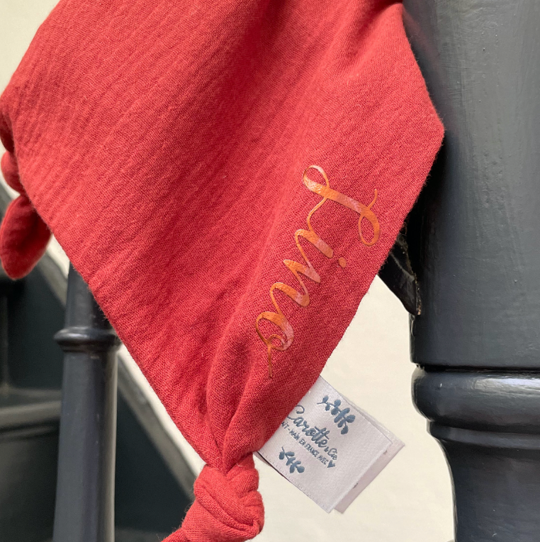 Doudou Hibou en double gaze de coton rouge terracotta personnalisable