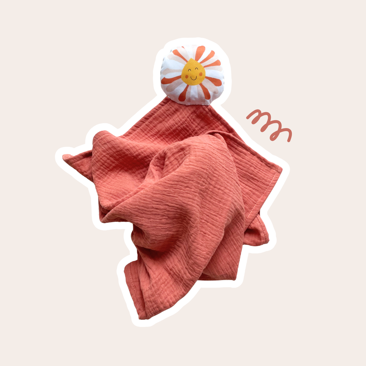 Maxi doudou Fleur en double gaze marsala; compagnon idéal de bébé