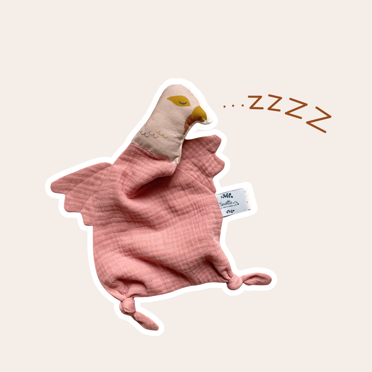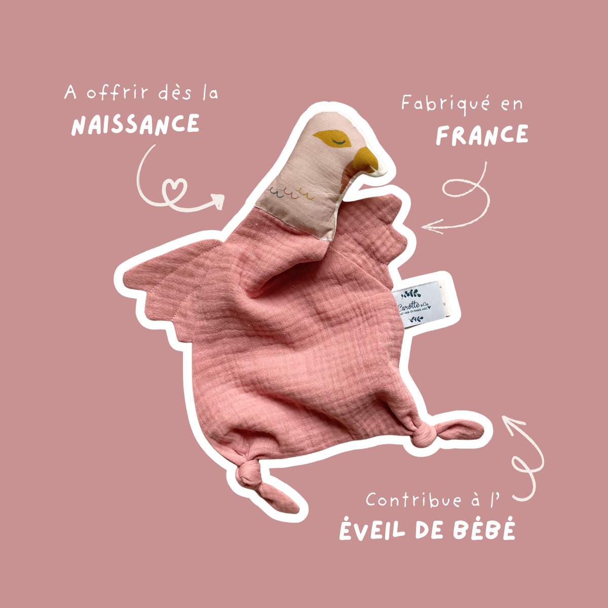 Doudou Oiseau en double gaze rose thé – Le Compagnon Idéal pour Bébé