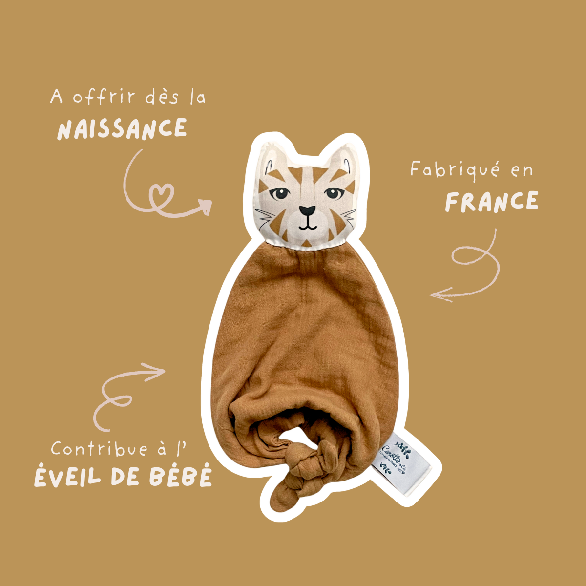 Offrez à votre bébé un doudou Chat en double gaze camel, ultra-doux et réconfortant. Confectionné en coton biologique, il respecte la peau délicate de votre tout-petit. Son tissu tendance et sa texture moelleuse en font le premier doudou parfait à câliner.