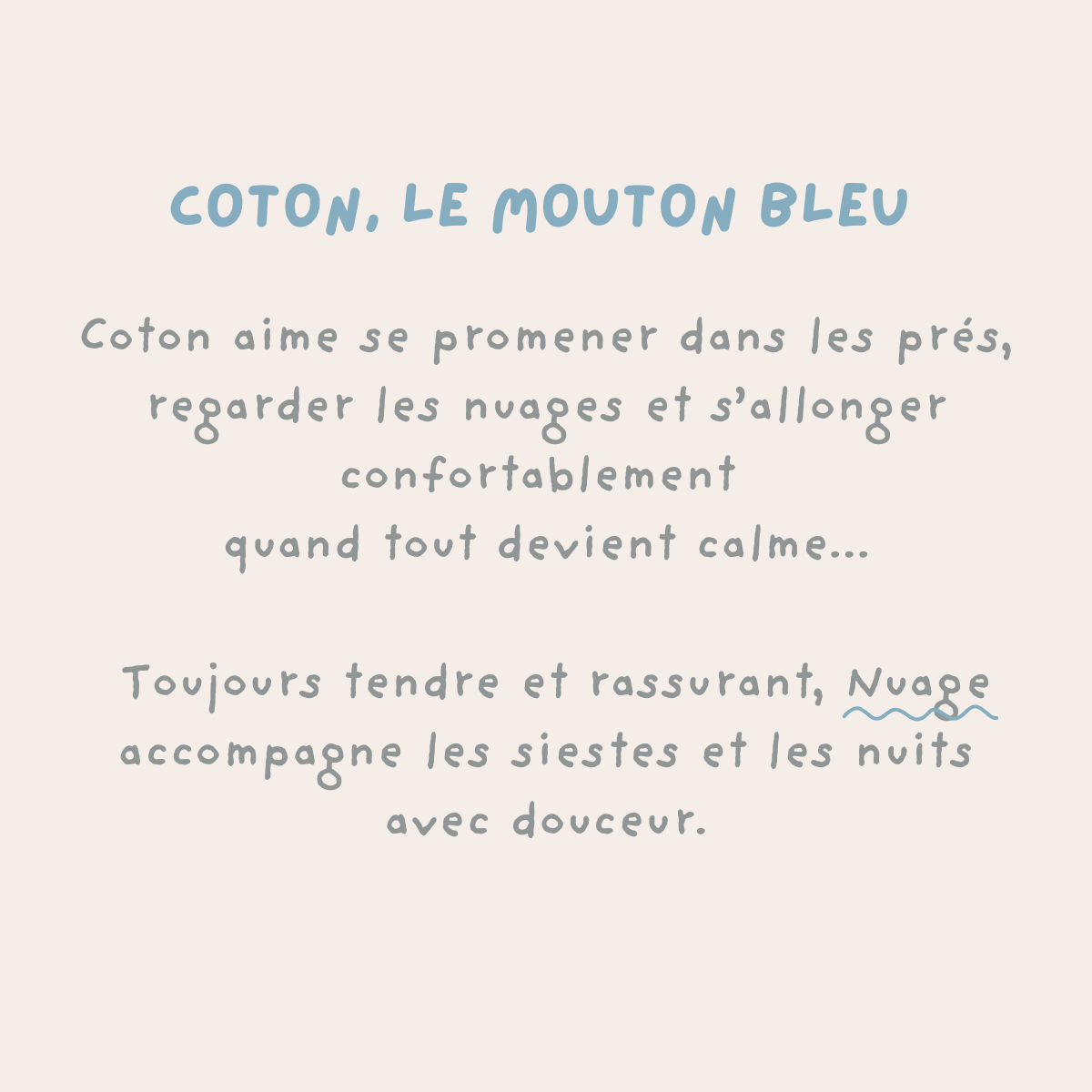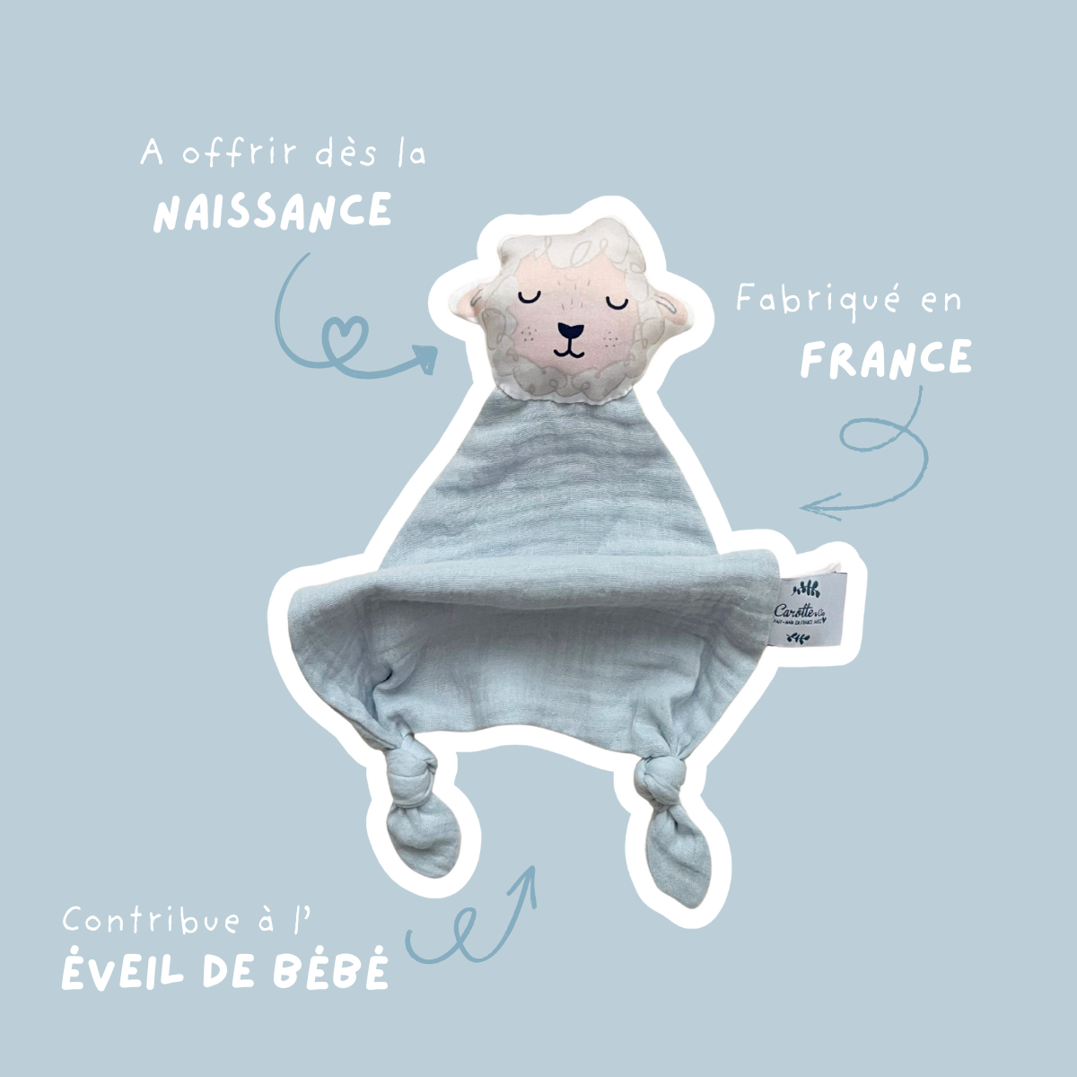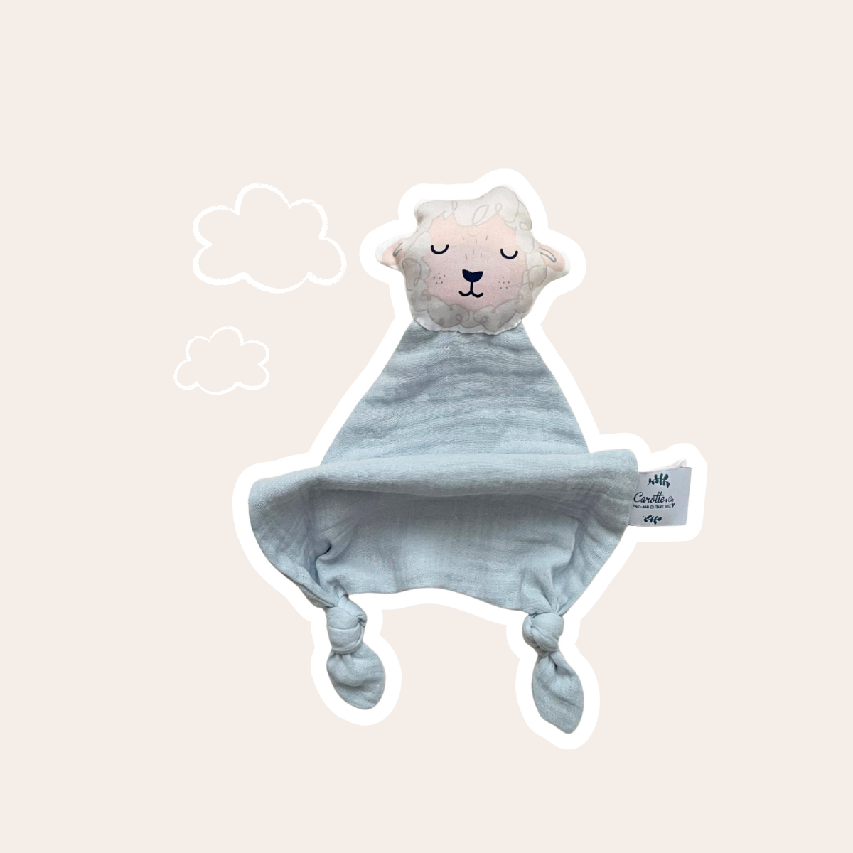Doudou Mouton en double gaze de coton bleu glacier; compagnon idéal de bébé