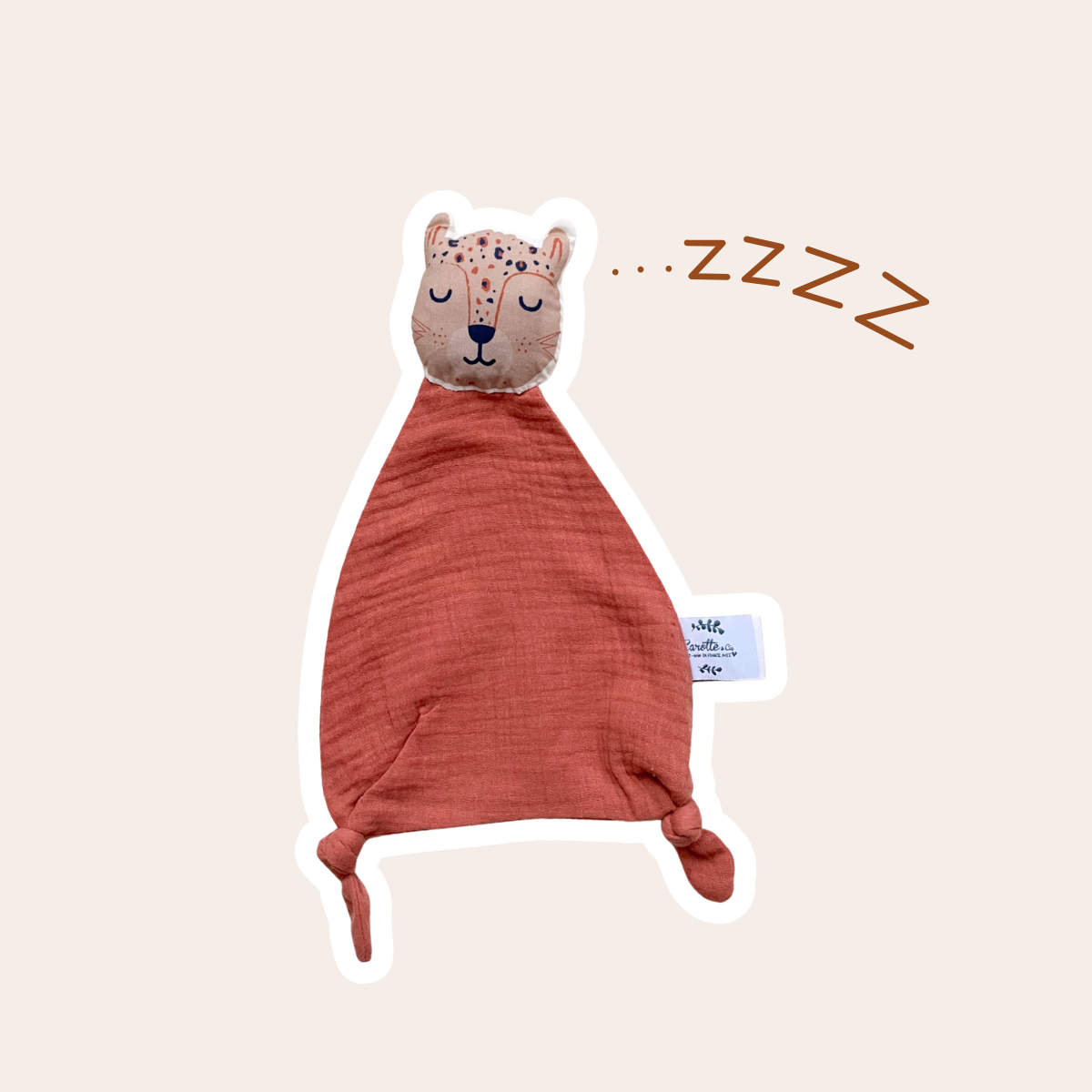 Doudou Panthère en double gaze marsala; compagnon idéal de bébé