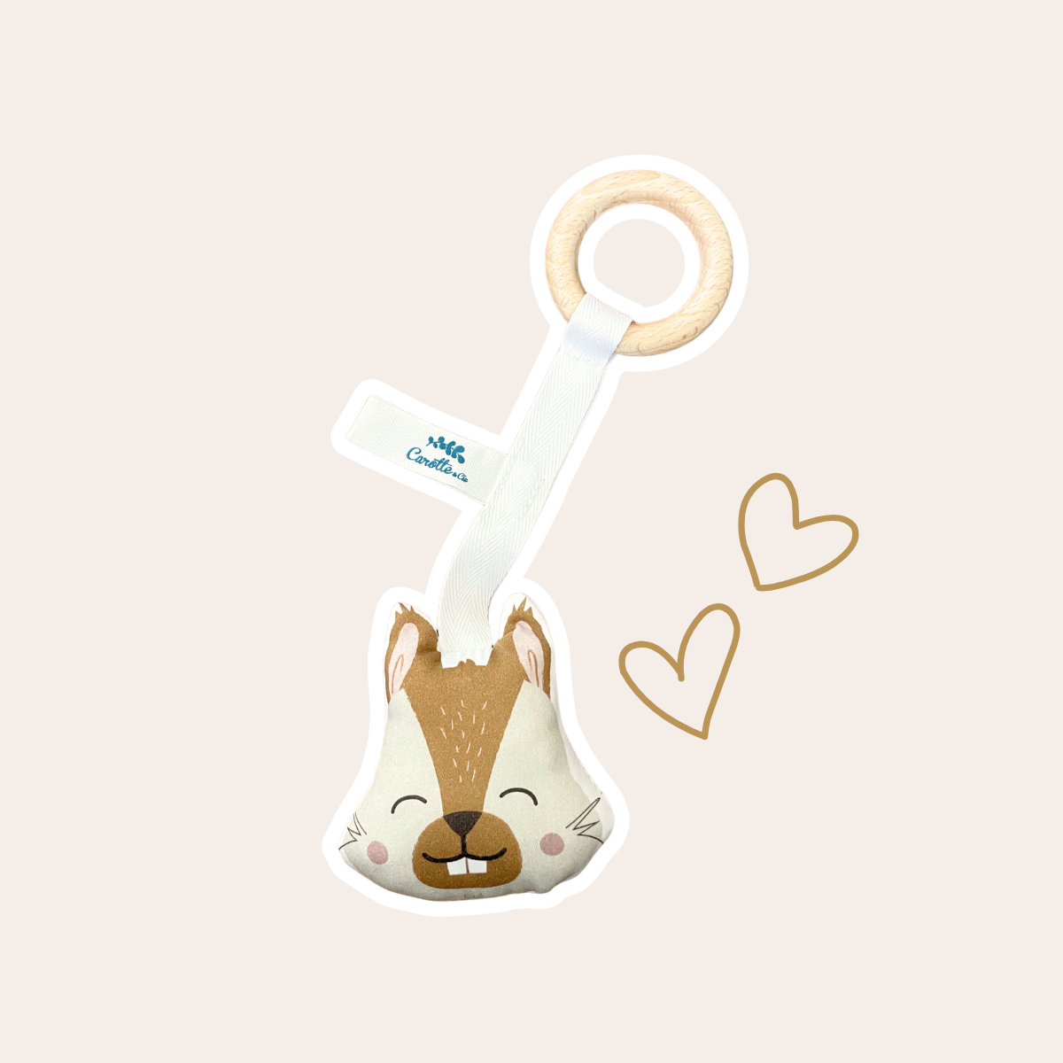 Anneau de dentition en bois et tissu Ecureuil camel personnalisable – Soulage naturellement bébé