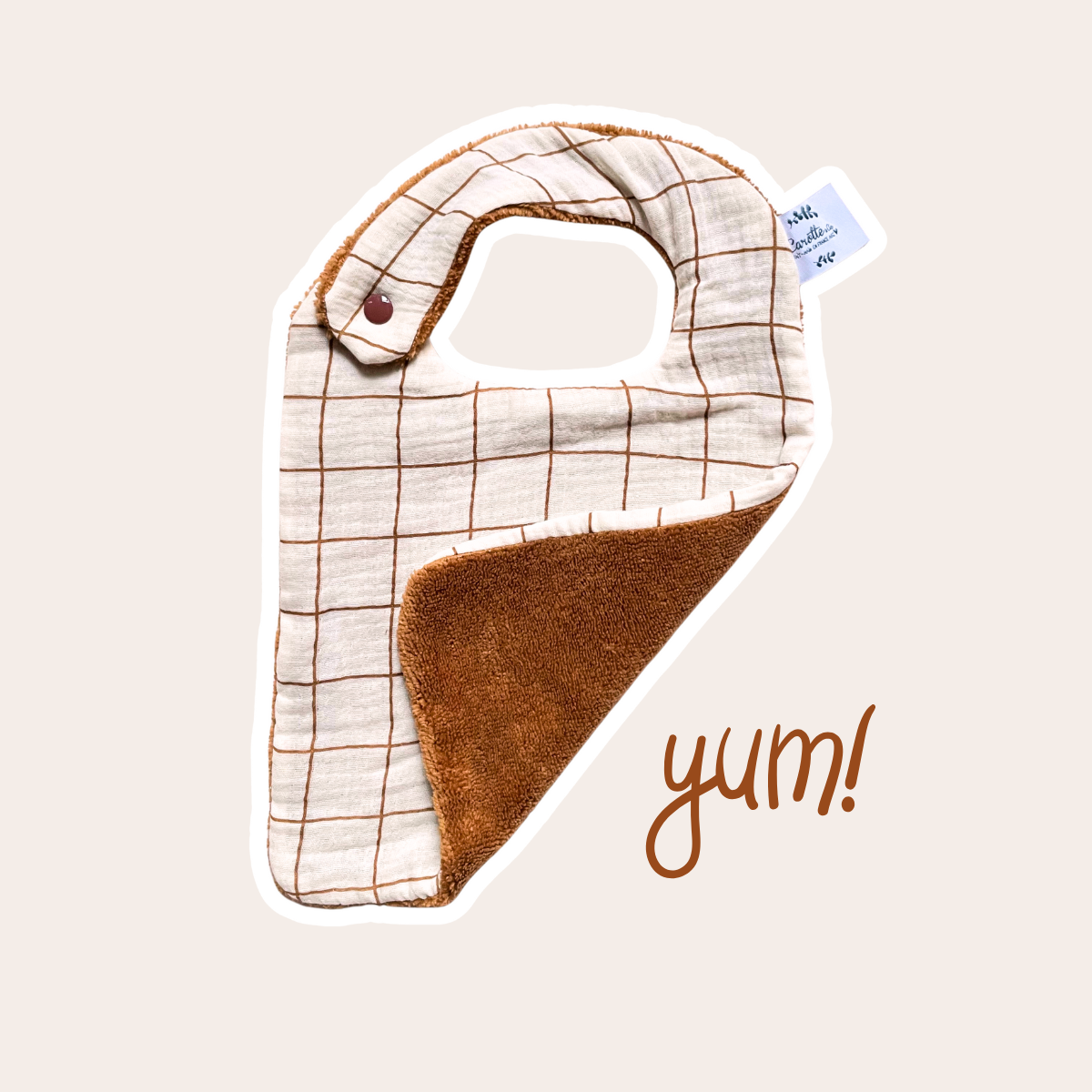 Bavoir classique à carreaux beige et camel en double gaze – Idéal pour les repas de bébé