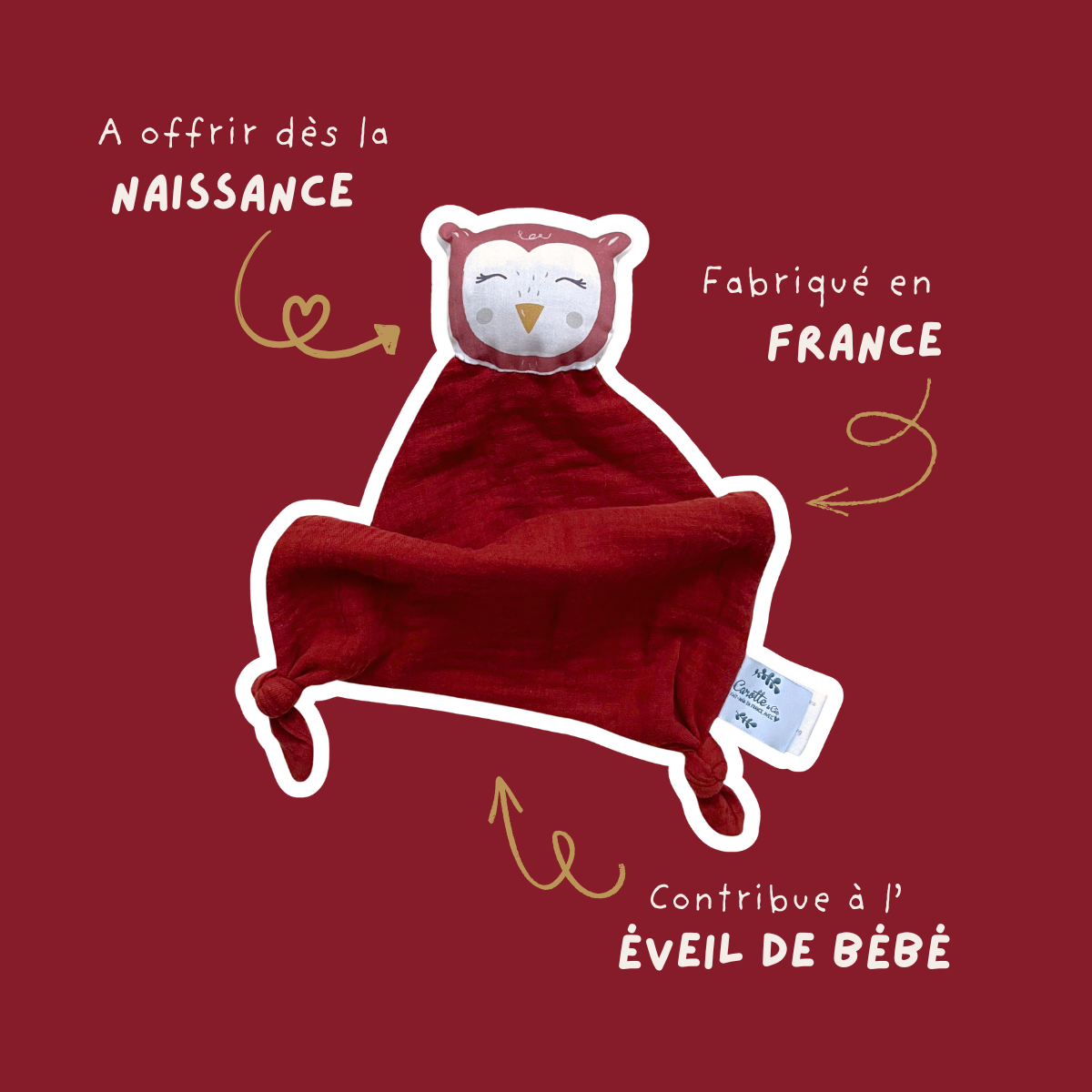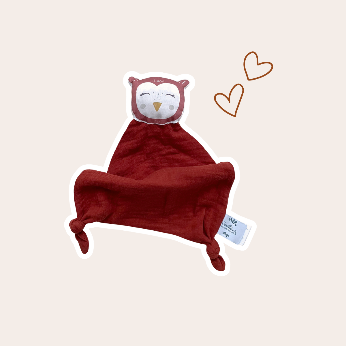 Doudou Hibou en double gaze de coton rouge terracotta – Le Compagnon Idéal pour Bébé